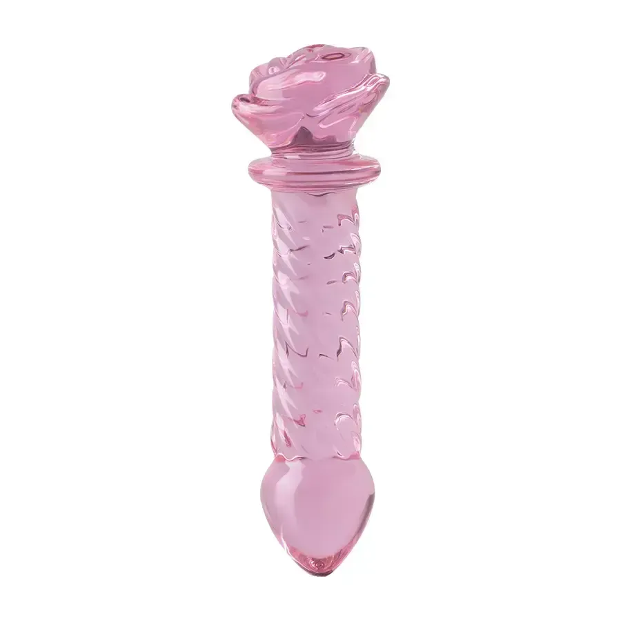 Plug anal de cristal rosado con lineas 3d en su cuerpo que intensifican el placer en la penetración , ademas tiene una rosa decorativa en su base.