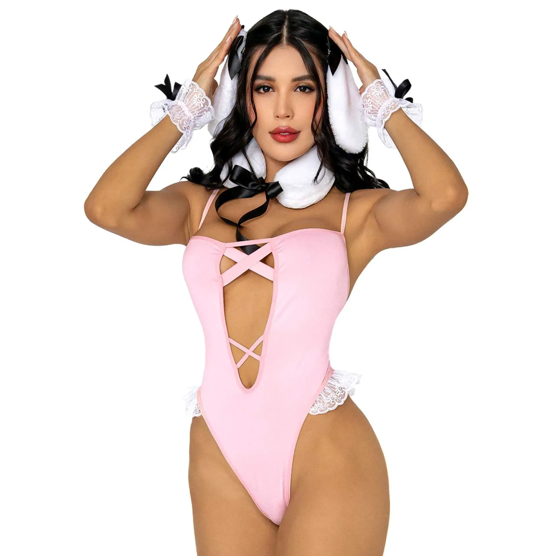 ¡Deja que tu lado más tierno y juguetón brille con nuestro adorable disfraz de ovejita! Este encantador conjunto incluye un body en un tono rosa pálido que abraza delicadamente tu figura, adornado con detalles de encaje en las caderas y en los guantes, que añaden un toque de ternur y sensualidad. El...