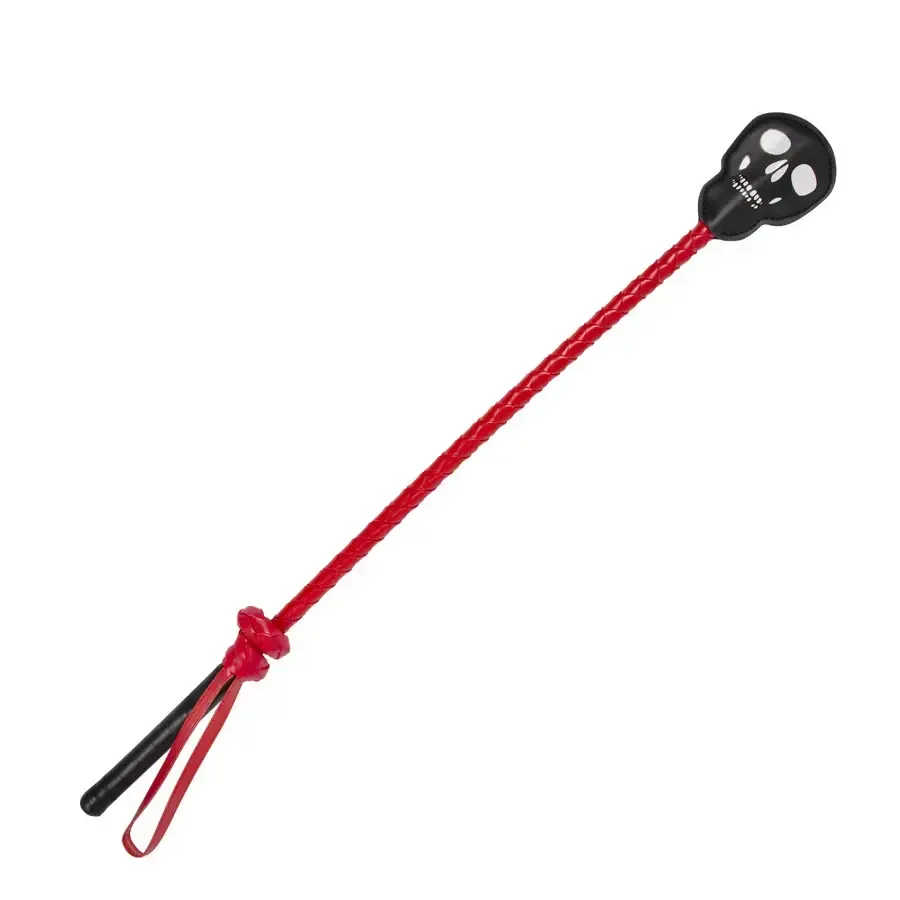 Látigo rígido elaborado en cuero sintético, con una pequeña cara de calavera en su punta para unas buenas nalgadas o práctica de spanking.