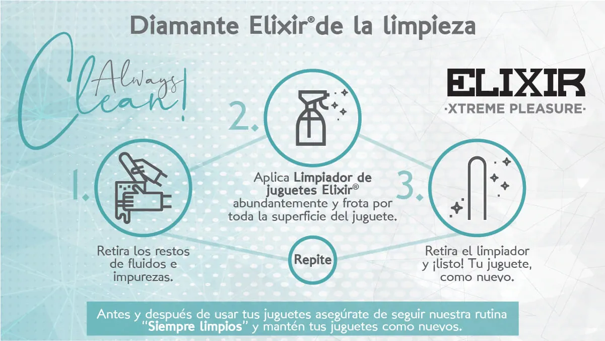 Diseñado especialmente para juguetes íntimos, cuida y preserva la silicona y demás materiales, proporcionando un mayor tiempo de vida útil a los mismos. Elixir fue desarrollado pensando en todas esas molestias ocasionadas por el m...